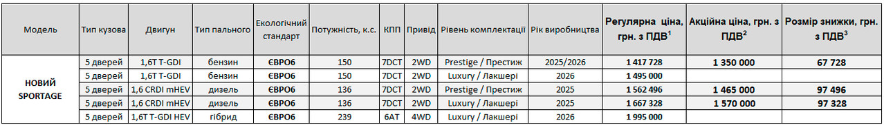 3Під знижкою (вигодою) маються на увазі знижки від регулярної ціни в розмірі: 67 728,00 грн - Kia Sportage 1.6 T-GDI 2WD 7DCT Prestige (Престиж) 2025-2026 року випуску; 97 496,00 грн - Kia Sportage 1.6 Diesel mHEV 2WD 7DCT Prestige (Престиж) 2025 року випуску; 97 328,00 грн - Kia Sportage 1.6 Diesel mHEV 2WD 7DCT Luxury (Лакшері) 2025 року випуску, на дату рахунку-фактури у порівнянні з ціною, що діяла до 09.01.2026. Суми знижок у гривні вказані з ПДВ. Зазначені розміри знижок не застосовуються разом з іншими знижками й не додаються до них.